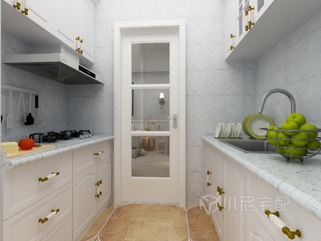 廚房的墻磚和臺面都采用了淡藍色的設計,清新自然