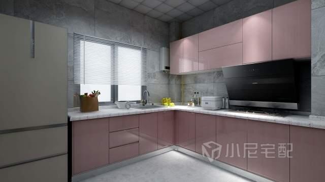 廚房在暗面,用了灰白磚和金屬粉櫥柜過度,提高廚房的亮度。