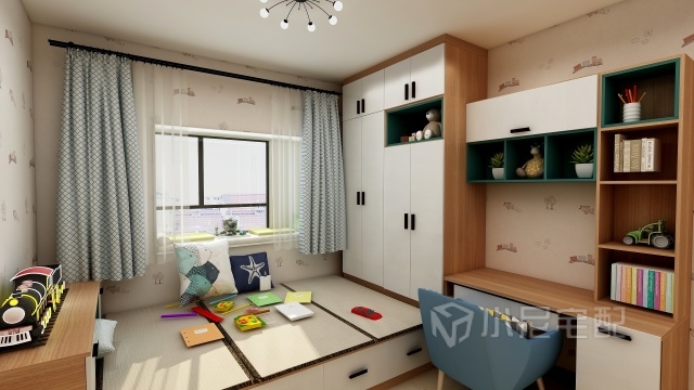 兒童房采用小尼宅配定制榻榻米方案,舒適的原木色柜體配上純白烤漆門板,加以藍綠色點綴,讓整個房間有了童趣感,配上簡單的書桌,滿足了小主人的所有需求。