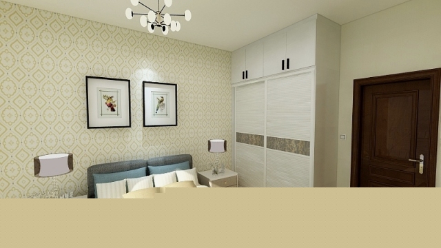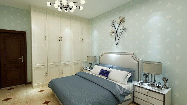 主臥室小尼宅配定制的衣柜給了主人很大的儲物空間,淡淡的藍色墻紙顯得整個房間舒適而透亮。