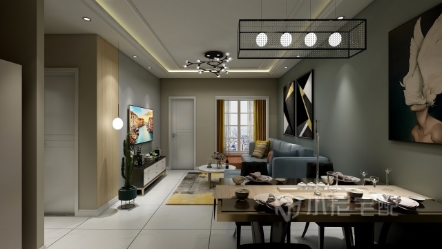 側面看木地板前面的吊燈也富有小心機。金屬的造型點綴其中。