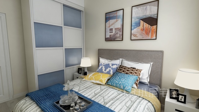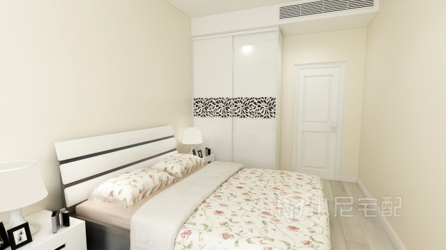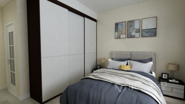 主臥用胡桃色柜體,搭配白色門板,穩重大方,床品用冷色調,給人一種安靜的感覺