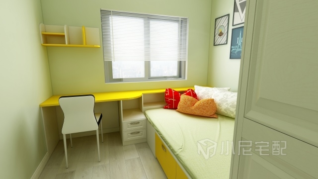 老人房不常住人,同時兼具一定的書房功能,淺色系給人寬敞明亮的感覺