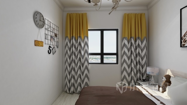 兒童房棕色床飾,配合黃黑相間窗簾,整個臥室立即活潑起來