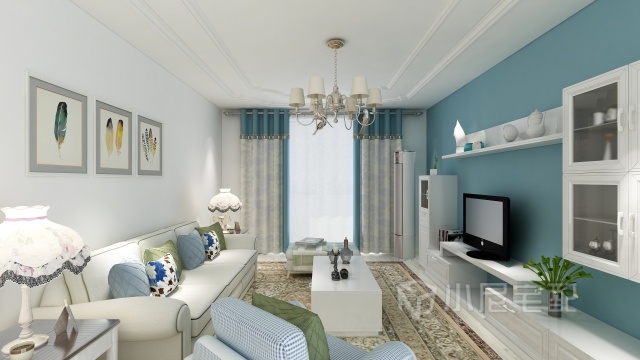 客廳定制白色簡歐電視柜,配合藍色背景墻與藍白相間窗簾創造出一種清晰自然的感覺