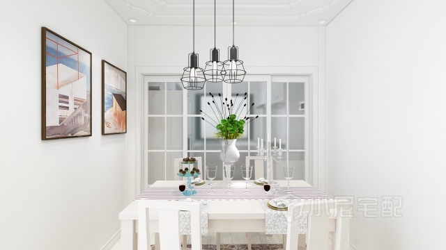 白色配套餐桌加上綠色植物花瓶點綴,墻面暖色裝飾畫讓人食欲大增