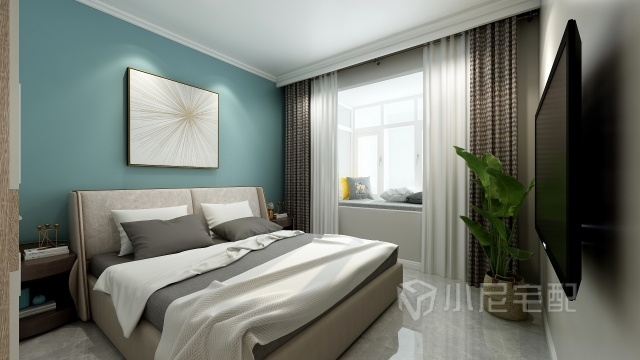 主臥以溫和的藍色為背景色,沒有多余繁瑣的線條,給人明凈清朗、如沐春風的感覺。