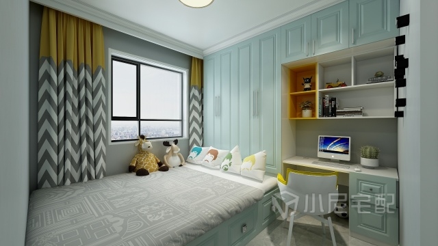 讓人放松的薄荷綠色,柔和的暖色燈光,再搭配玩偶的組合,兒童房進一步強調溫暖恬靜的氛圍