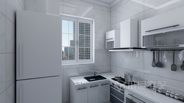 現代簡約的廚房搭配亮面的淺色墻磚讓廚房變的更加潔凈。