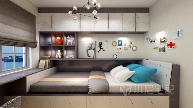 次臥辦公,休息,收納于一室,讓每一寸空間物盡其用。單區(qū)間的圍合空間,采用立體式環(huán)抱包圍,在風(fēng)水上叫藏風(fēng)聚氣