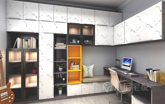 書房燈帶的設(shè)計(jì)不僅起到裝飾的作用,還烘托了整個(gè)空間的浪漫氣氛,使空間形象展示與結(jié)構(gòu)展示更具現(xiàn)代美感。玻璃掩門設(shè)計(jì),干凈防塵好儲物,物品一目了然。