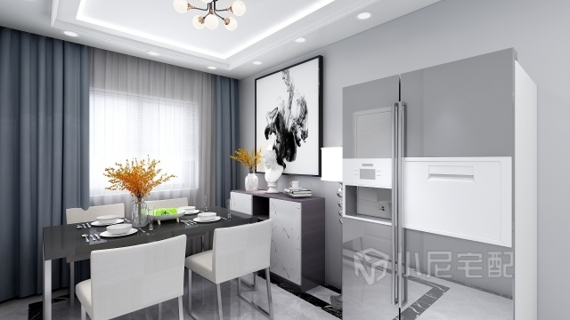 餐邊柜在儲物的同時(shí)也兼顧了展示的作用,白色門板柜可以放置餐具和擺放收藏品,此外還特意設(shè)計(jì)了小型的圓弧臺面,方便在上面進(jìn)行簡單的備餐