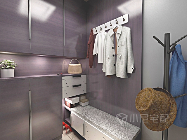 功能區(qū)間明確,中間開放格可以擺放裝飾品和小的物件,下柜貯藏鞋物,桌面放置出門的必須品,矮柜可以在上面休息換鞋,大的衣物就可以掛在長衣區(qū)。整體裝飾型強(qiáng),充分展現(xiàn)出獨(dú)特的設(shè)計(jì)風(fēng)格。