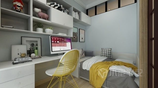 在小孩房的設計中以孩子活動空間為主的同時保證了睡眠的需求。淺綠色的墻面和檸檬黃色的搭配給了孩子夢想的空間,也給孩子活潑好動的自由空間。