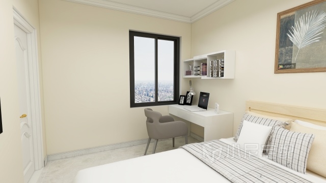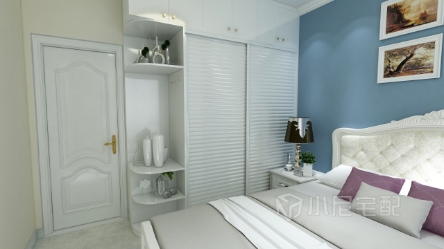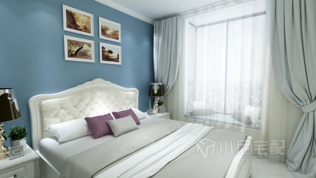 床頭墻面用冷色,搭配白色窗簾,給人靜謐的感覺