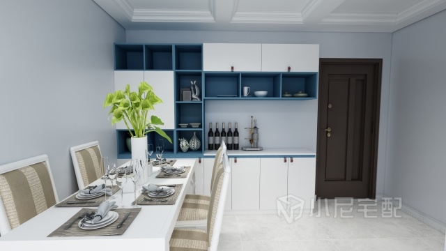 藍色和白色搭配的柜子,既能收納鞋子,也能當餐邊柜使用,使得空間最大化利用