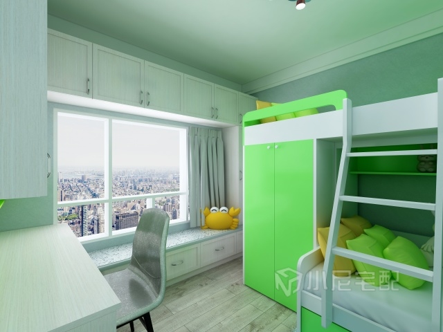 兒童房做了一個飄窗柜,飄窗柜和寫字桌連接。