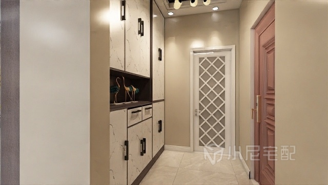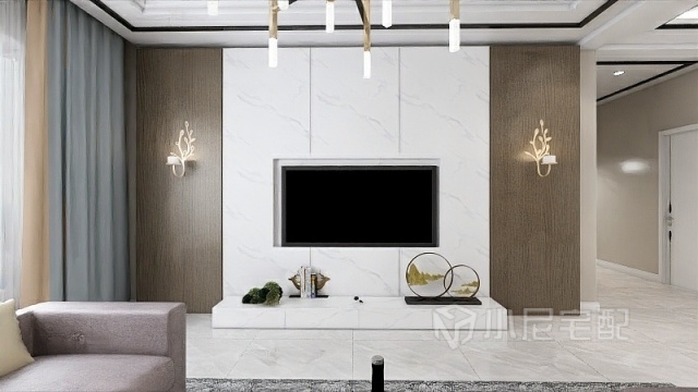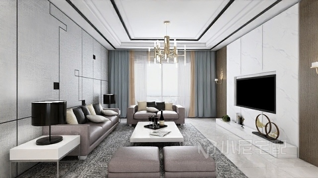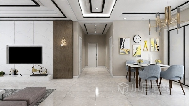 逐影隨行系列全屋定制家居,盡顯低調奢華的內涵。頂面為三級吊頂、鈦金條裝飾。
