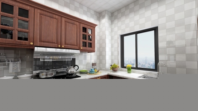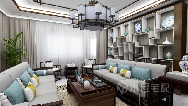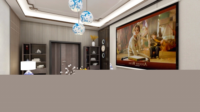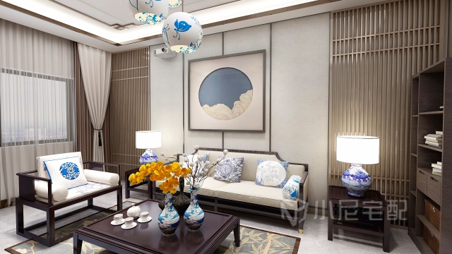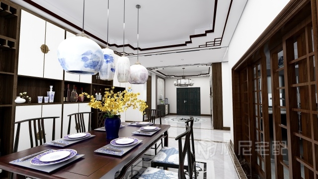 這是一個以瓷元素為裝飾元素的新中式風格的別墅的一層,包括客廳、餐廳、視聽室、廚房、保姆房以及車庫。