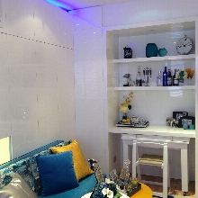 硬裝:白色烤漆飾面板,西班牙米黃石材,拉絲不銹鋼。仿西西里灰石材瓷磚。