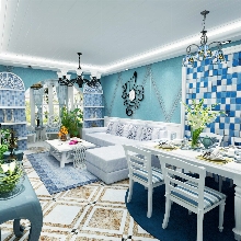 地中海風(fēng)格以藍(lán)色為基調(diào),有文藝、清爽感,常見(jiàn)的燈塔、帆船、海星等小裝飾也給家裝增添了不少海洋清新感。整個(gè)家居設(shè)計(jì)展現(xiàn)蔚藍(lán)色的浪漫情懷,海天一色、艷陽(yáng)高照的純美自然氣息。家居家裝一體價(jià):15w。