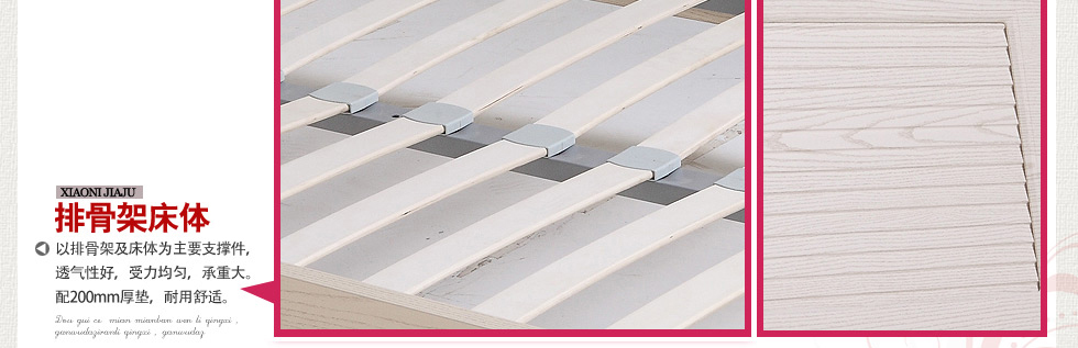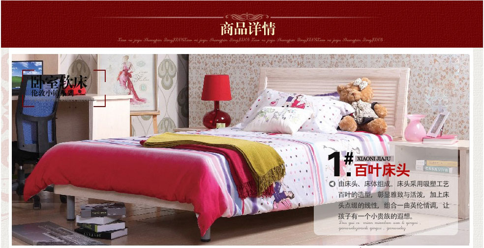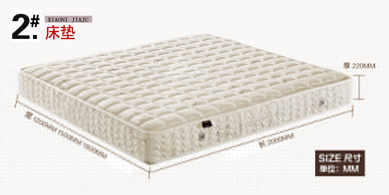 | 規格 | 床頭:270*128*927mm 床體:2035*1260*323mm 床墊:1200*2000*200mm 排骨架:1200*2000*50mm 衣柜:908*533*2075mm 字臺:1200*1080*1995mm 床頭柜:558*401*448mm |