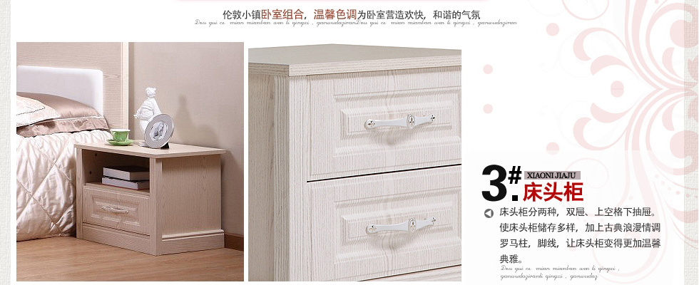 | 細節描述 | 床頭采用吸塑工藝,百葉造型,彰顯雅致與活潑;簡約的床頭柜,小巧精煉,配上羅馬柱等線型,更顯文雅;字臺以白橡做舊的紋理,古典韻味的線型,同時又顯得精致靈動;衣柜經典古樸,采用古典線型,時尚雅致的百葉門及獨具匠心造型的屜面,并加上懷舊懷舊的白橡紋理使整個衣柜氣質非凡;椅子以弧形的線條靠背、固定扶手,簡單的造型,卻能給孩子舒心的學習體驗。 |
