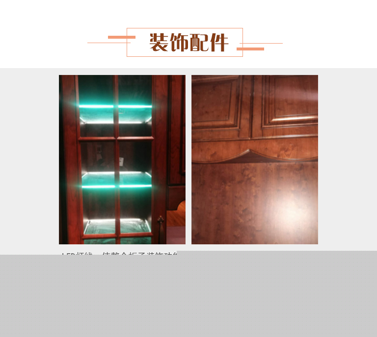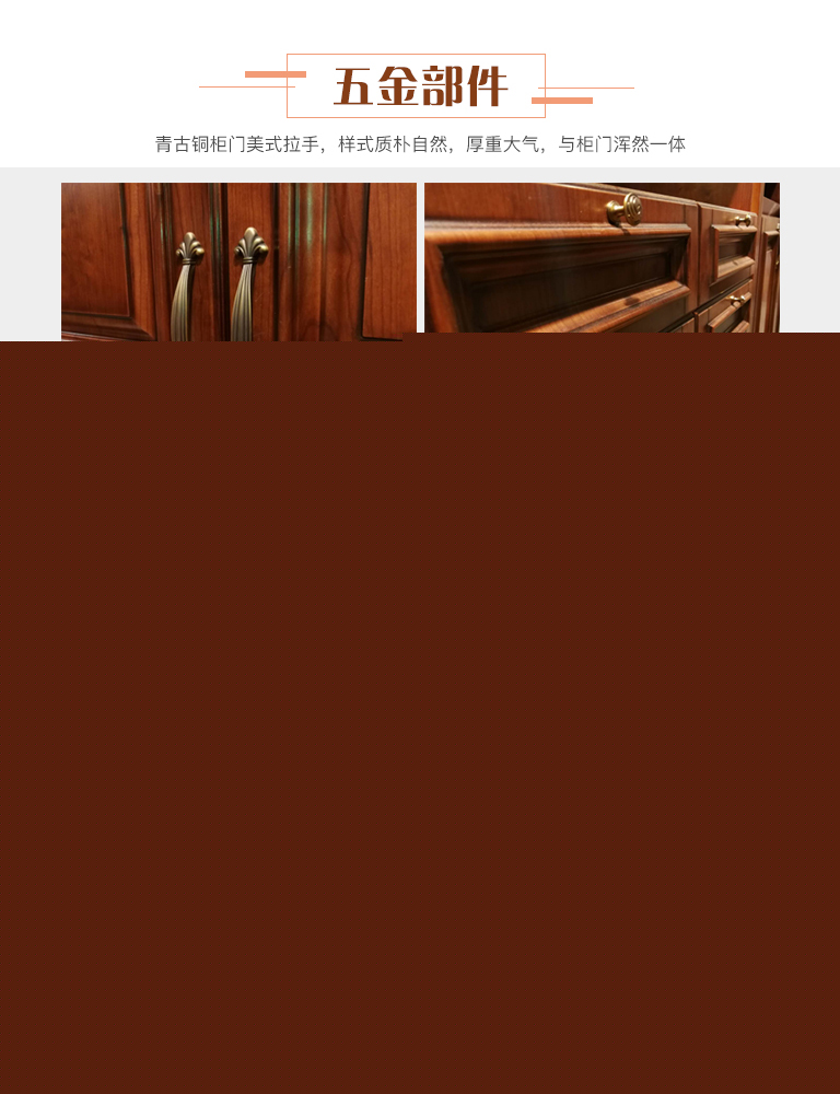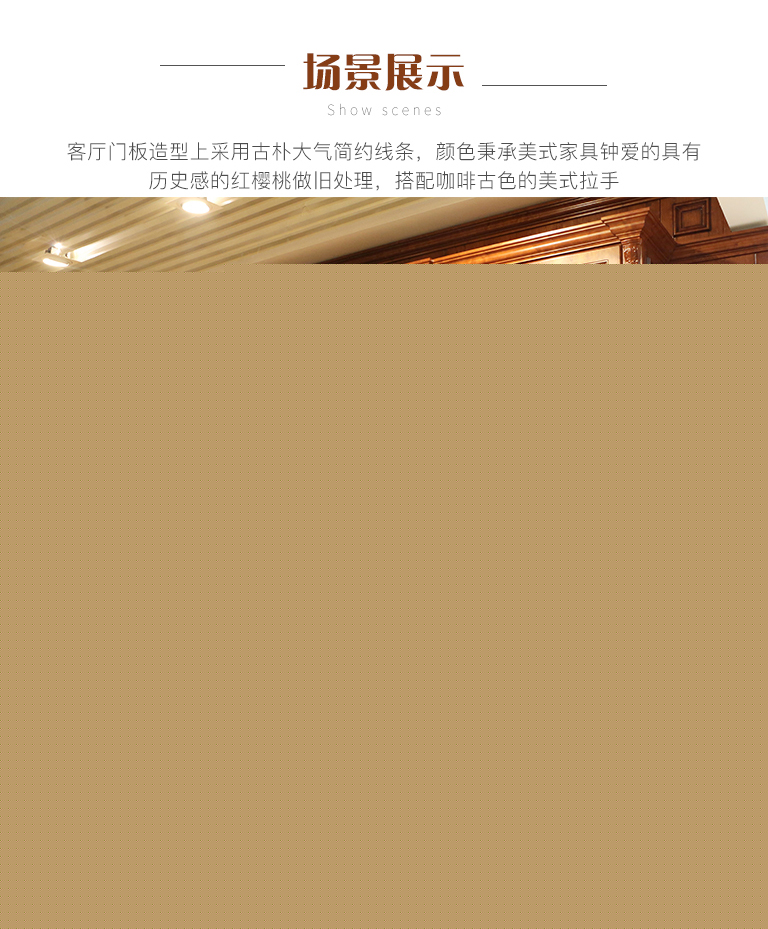 | 細節描述 | 客廳門板造型上采用古樸大氣簡約線條,顏色秉承美式家具鐘愛的具有歷史感的紅櫻桃做舊處理,搭配咖啡古色的美式拉手。注重黃金比例設計,巧妙的柜體結構形成對稱,強調家具帶給人的平和感,并且把現代的功能納入其中,裝飾效果好,穩定性強,儲物更加方便。 |