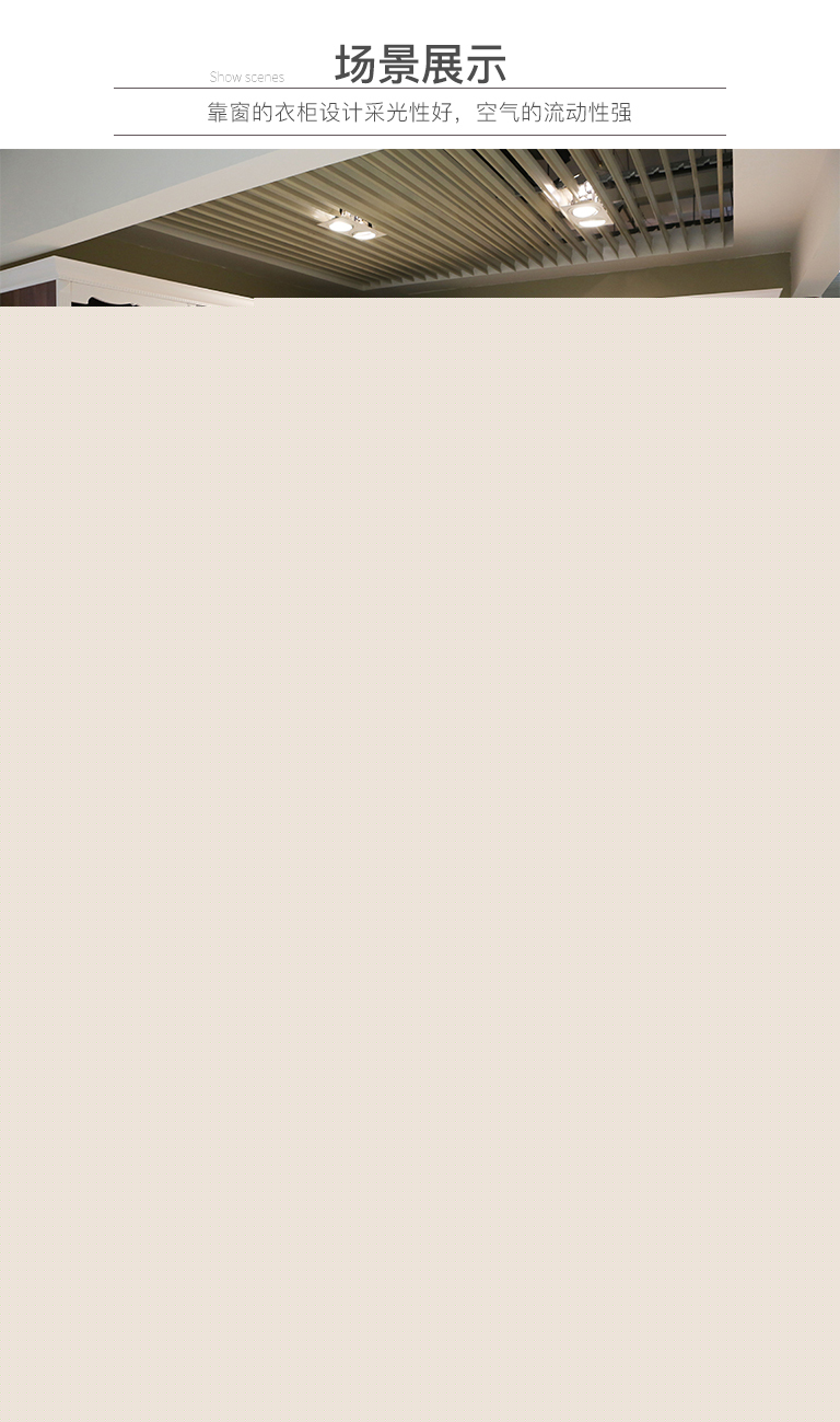 | 細節描述 | 這個空間分區比較規律,靠窗的衣柜設計采光性好,空氣的流動性強,開放格透明玻璃門板讓所有的衣物明朗的呈現在眼前,減少盲目翻找的不便,讓衣物的儲藏從無序狀態變為僅僅有條。中間的島臺可以方便的放置各種首飾或者領帶,整體的立體感強,空間亮度好。 |