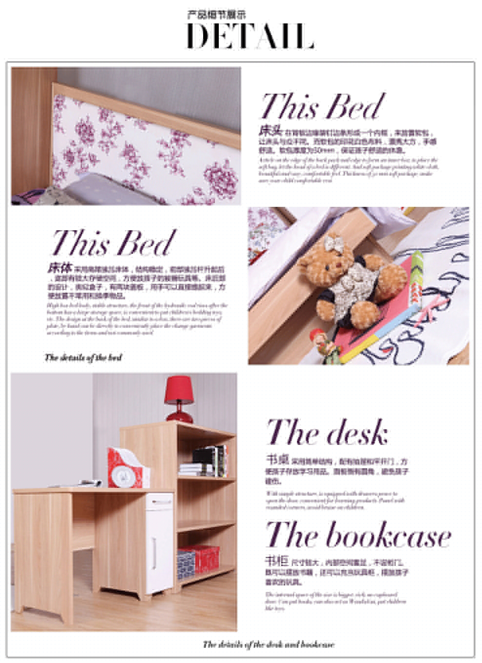 | 規格 | 書架:2445*366*1797mm 電腦桌:1000*500*745mm 書柜:1000*500*1227mm 衣柜:900*420*1797mm 床頭:1364*36*1000mm 床箱:2035*1260*400mm 床墊:1200*2000*100mm 三屜柜:798*420*639mm 裝飾鏡:1200*600*25mm |