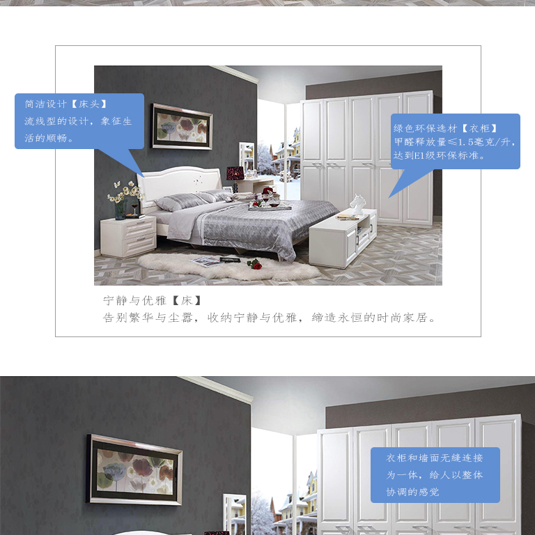 | 規(guī)格 | 外掛門(mén)衣柜:2250×580×2250mm、床頭柜:520×400×429mm、床:2155×1910×360mm、床墊:1800×2000×250mm、臥房電視柜:1700×400×429mm、妝臺(tái):1020×400×1510mm、妝凳:400×310×450mm |
