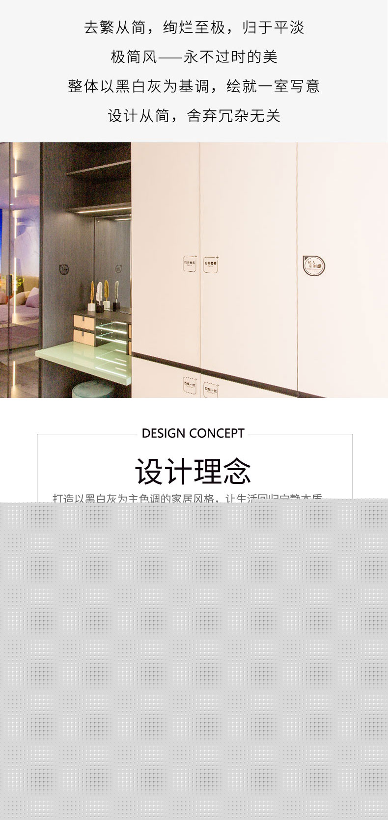 去繁從簡,絢爛至極,歸于平淡,極簡風——永不過時的美,整體以黑白灰為基調,繪就一室寫意,設計從簡,舍棄冗雜無關